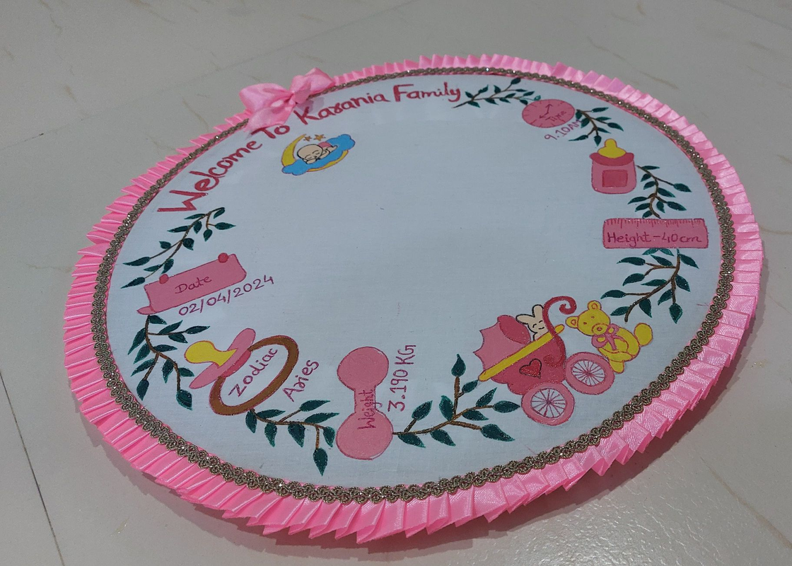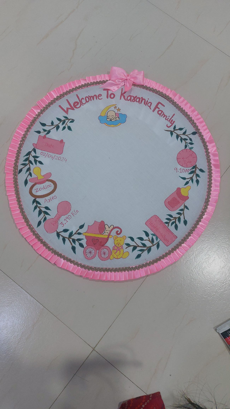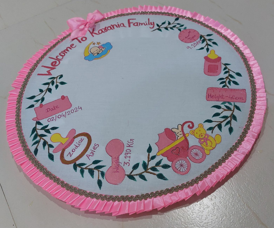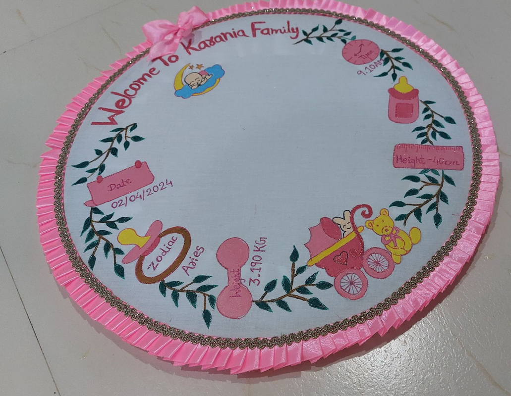 Hand painted welcome baby HoopWelcome your baby with this Beautiful hand painted hoop and make your day memorable. And you can frame it and save your memories. Any type of customisation dm or contact us 97029 09397